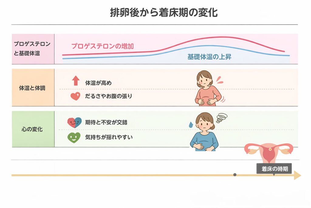 軽いだるさや腹部の張り、気分の変動などを感じる方もいます。これは決して異常ではなく、体が妊娠に向けて準備しているサインです。